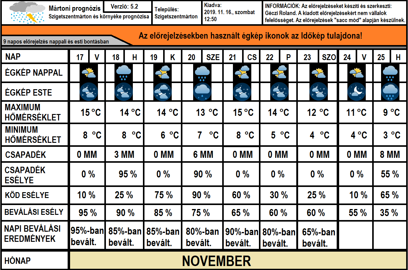 2019. 11. 16,. szombat, 12:50-kor kiadott előrejelzés: